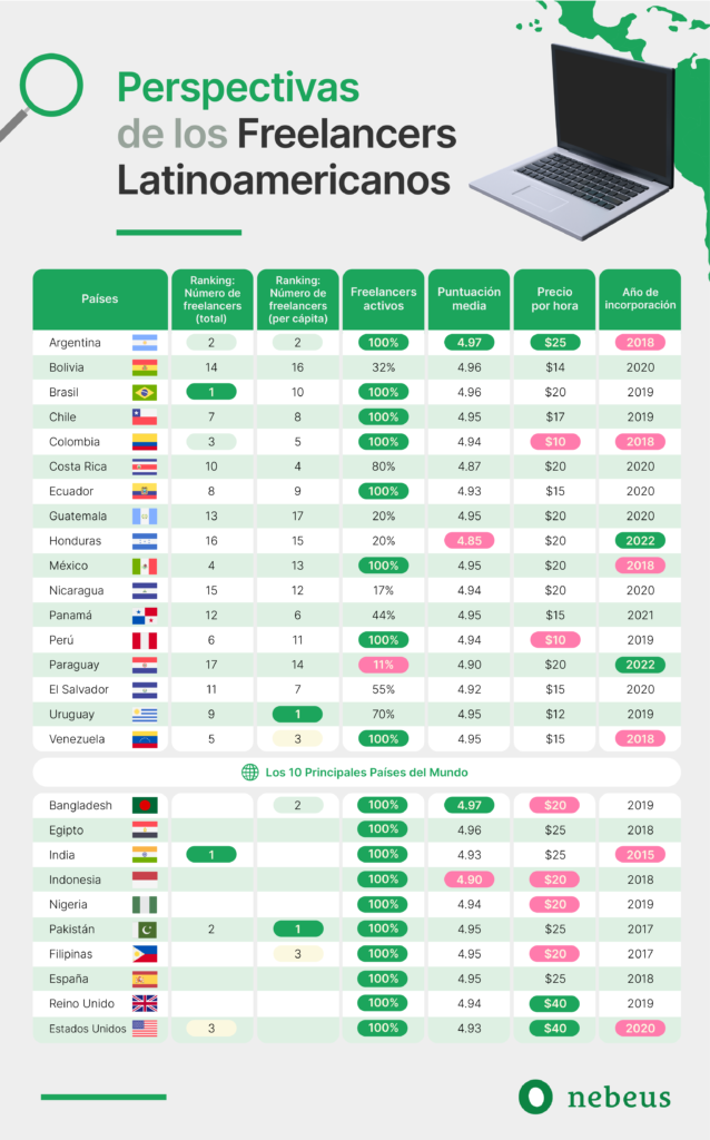 Como has podido observar, los datos del análisis de Nebeus arrojaron que Colombia es uno de los países de América Latina que tiene a los profesionales independientes más experimentados, así como los autónomos con las tarifas más asequibles de la región. Gracias a esto, el país se posiciona en el tercer lugar del ranking de toda LATAM en el volumen de autónomos.