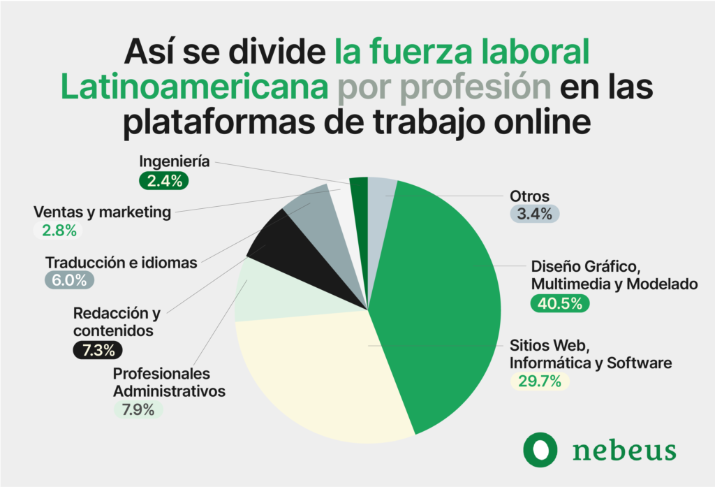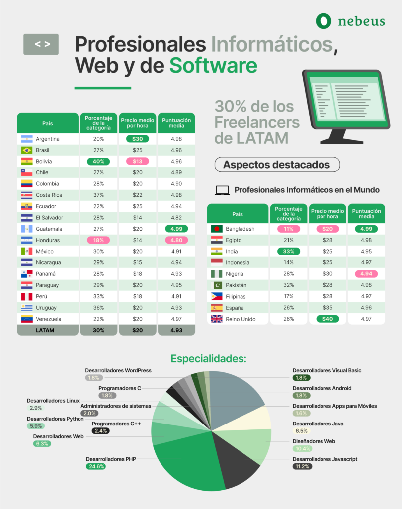 Otra área importante es la de la informática, ya que los profesionales freelance IT en América Latina representan un 30%. Es importante resaltar que el porcentaje de estos autónomos es uno de los más altos en comparación de otros países, ubicándose en el tercer lugar a nivel mundial. El mayor número de nómadas informáticos están en Bolivia, Costa Rica y Uruguay.