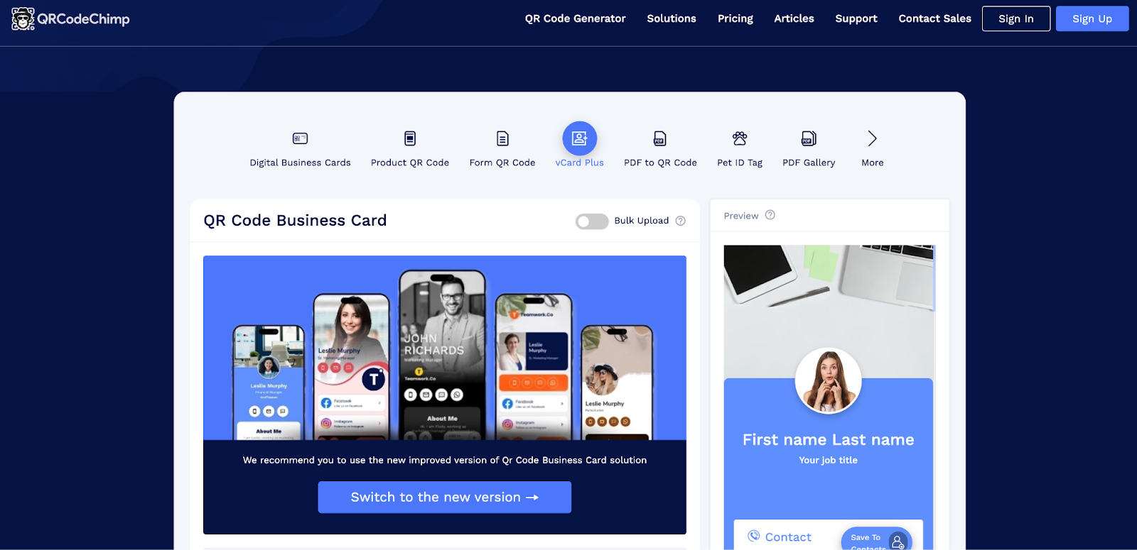 Por qué está en nuestra lista: VCard Plus sobresale en los aspectos técnicos de la creación y gestión de códigos QR. Es una de las mejores tarjetas de presentación digitales para marketeros que dependen de la precisión, la marca y la interacción medible, especialmente cuando trabajan a gran escala.