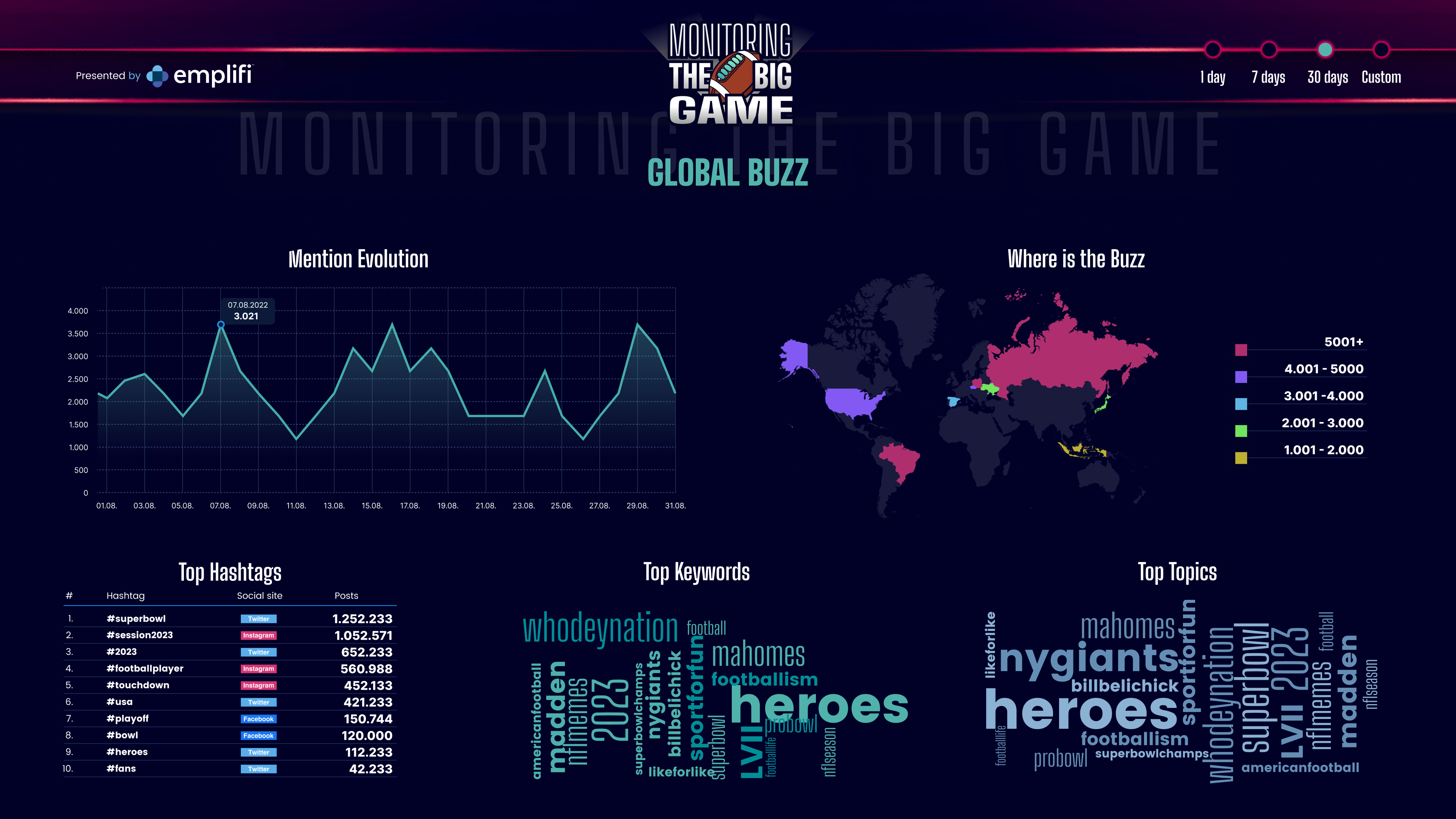 Manténte al día de la conversación en tiempo real alrededor de los grandes eventos deportivos en todo el mundo con el Live Listening Dashboard de Emplifi, y sigue este domingo el buzz en torno al gran partido en el que se enfrentarán los Jefes de Kansas City y las Águilas de Philadelphia.