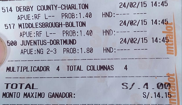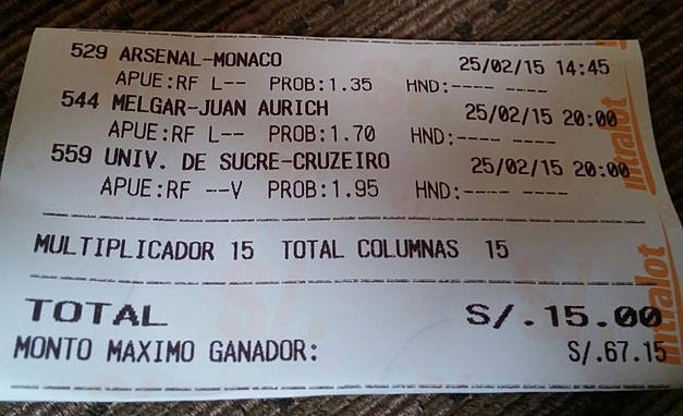 Hace unos días, decidí apostar S/. 1.00 a una jugada, lo cual generaba una ganancia neta de S/. 2.55. Algunos pueden reírse y decir. ¿Quien apuesta S/. 1.00 para ganar S/. 2.55? Pues… ¿Cuál fue el resultado? ¡¡¡GANE!!!